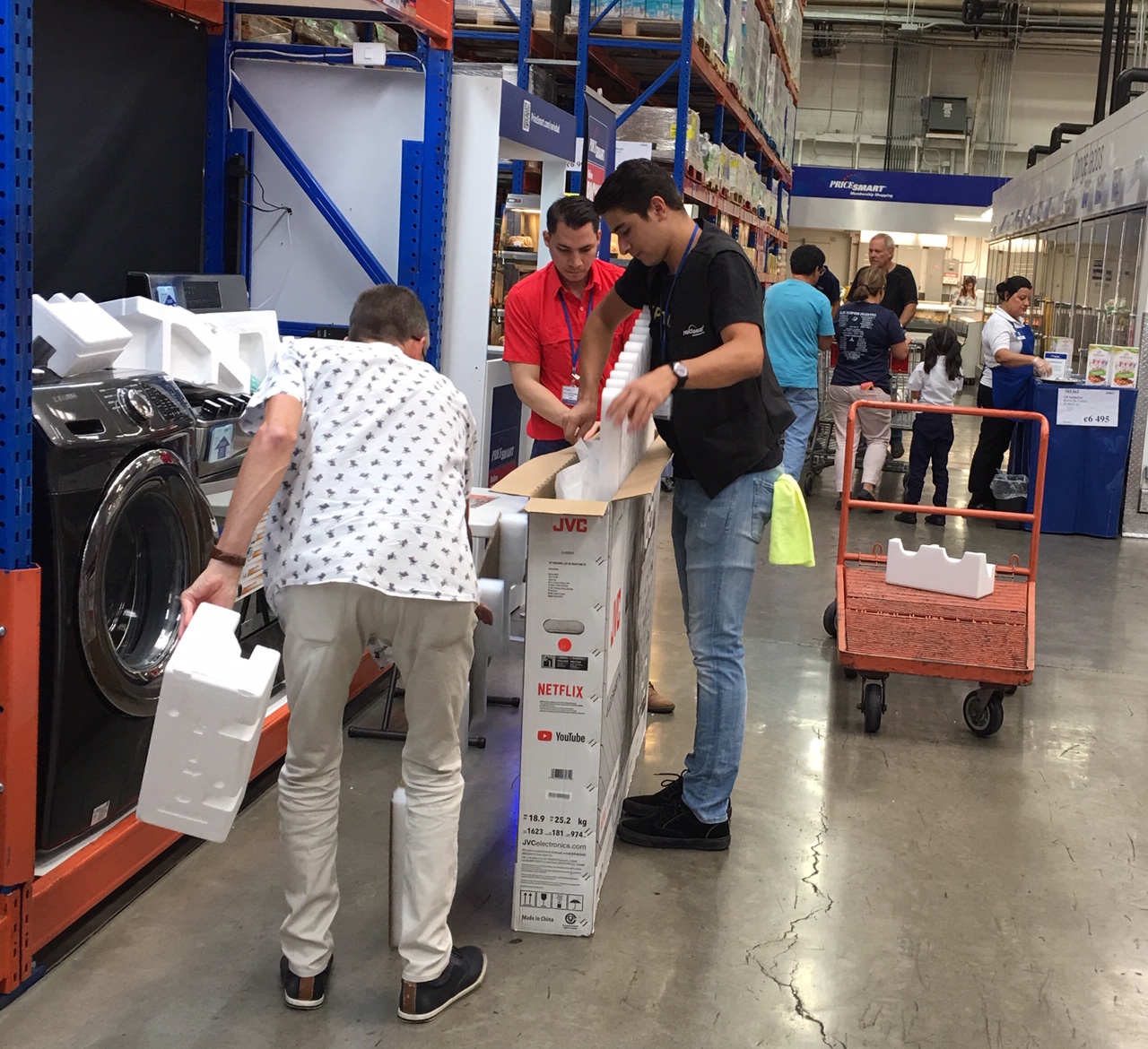Now red-shirt guy took over. He pointed to the TV area, and the three of us walked over the TV we had selected. There were several in boxes under the display model. Red-shirt guy walked over to the cell-phone kiosk guy and talked to him briefly, then returned. Then red-shirt guy talked to another guy, who brought in yet another guy with a black PriceSmart vest. Red-shirt guy pointed to black-vest guy and said, “English.”