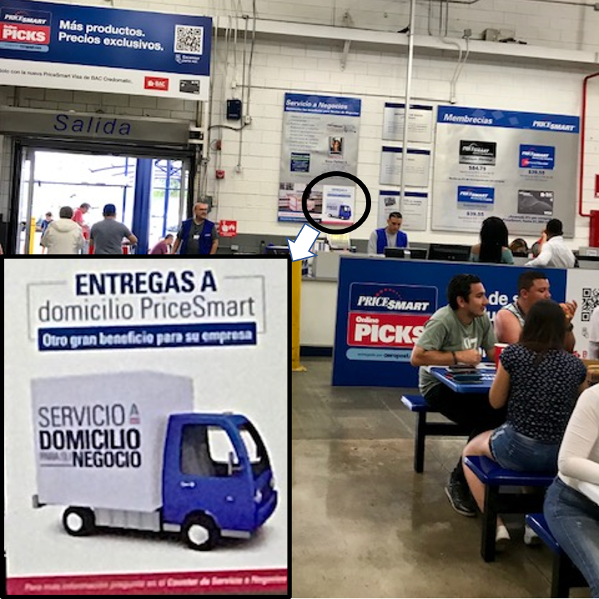 At that point another PriceSmart guy in a red shirt walked up to the service counter. The service counter guy and red-shirt guy had a conversation that was clearly about us. While they were conversing, I noticed that there was a sign above the service counter with the words “Entregas a domicilio PriceSmart”. “Entregas” sure looked like a verb conjugation of “entregar”, “to deliver” that we had jotted down on the index card. And, “domicile” sure was like “domestic” or “home” in English. A ha! Seemed like we were in luck on the delivery!
