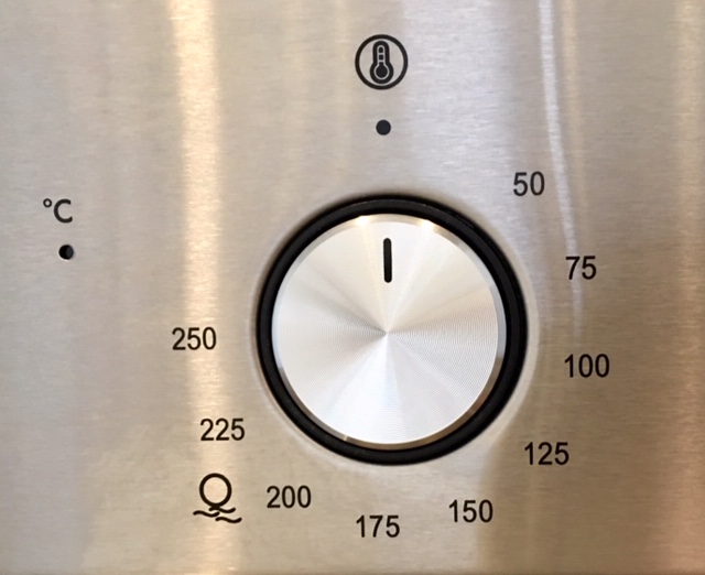 Our cookie recipes called for the oven to be set at 375 degrees Fahrenheit. John used a Fahrenheit to Celsius converter on his cell phone and did the conversion. 375 degrees Fahrenheit is 190.556 degrees Celsius. Oh, that’s easy, NOT. You push the knob, it pops out, and then you can move the dial. (And no, the top digital display does NOT display the temperature.) Where in the world do you set 190.556 degrees Celsius? Even if you wanted to do an even 200 degrees, it’s not obvious – point it at the 2 of 200, the first 0, the second 0 – where exactly? And, at what point between the 175 and 200 markings is 190.556? I settled for what I thought was slightly below 200, to the right of the last 0 in 200. I had the temperature, or something close, but now actually had to start the oven.