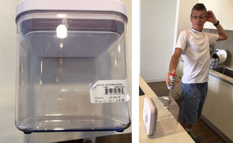 For example, all the plastic tubs we bought for refrigerating items/leftovers had stickers on them. All the dishes we bought had stickers on them. All the utensils we bought had stickers on them. Everything you buy has these stickers! You can’t just peel off the stickers from whatever it is you just purchased. You can get part of it but not all of it. Even what is left after you try to peel off the stickers doesn’t come off with soap and water. (Maybe if the water were really hot, but we don’t have really hot water…)
