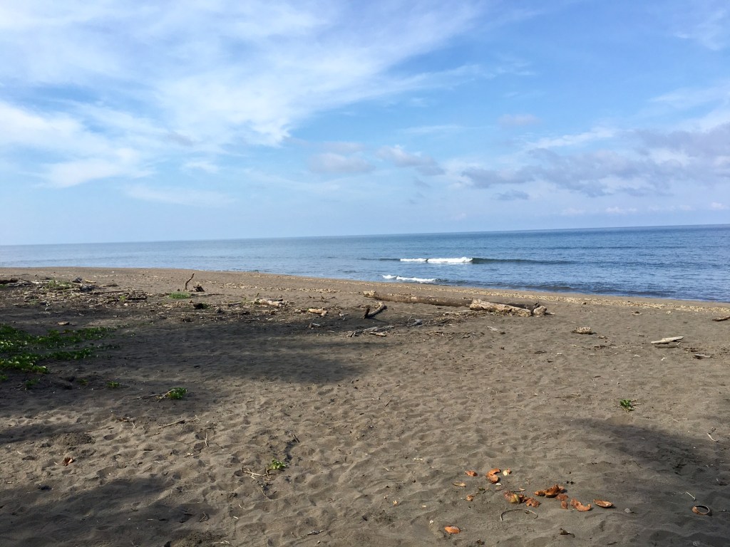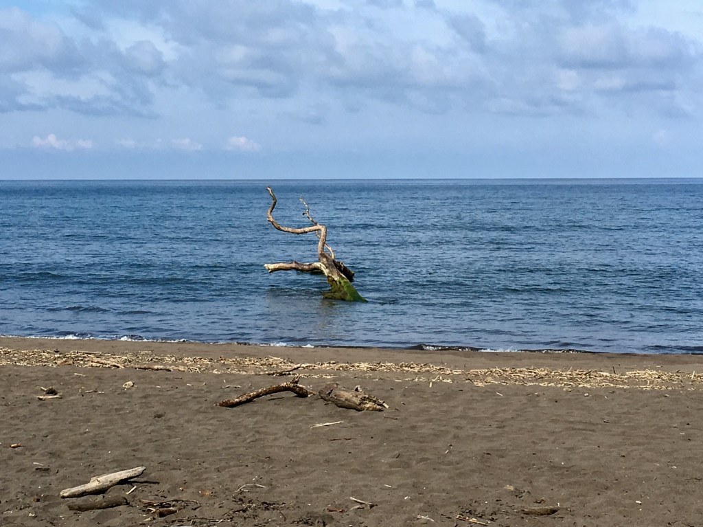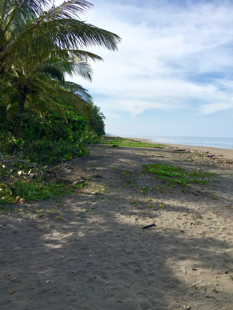 On Friday afternoon, we went on the Tortuguero Village tour included with our package deal. The tour was led by Bernardo, and included the Spanish-speaking couple and ourselves. The other two from the usual suspects had left that morning to meet up with their friends in Limón. (We’ll have more about the town tour in our next post.) Because it was a town tour, I wore tennis shoes. Little did I know that Bernardo’s first stop on the town tour was the beach.
