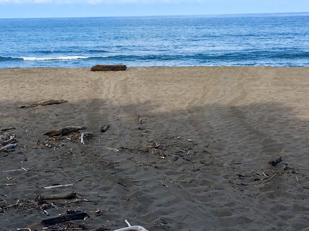 Green sea turtle eggs hatch after about two months. The next thing our guide led us to was a baby turtle trying to make its way to the sea. The nesting season had been going on for several months so baby turtles were hatching from previous egg laying events. The tour guide stood in front of the baby turtle with her red flashlight and provided a lighted path to the sea. It was so cute as it scampered over the sand with its little flippers! It successfully made its way into the waves, and we all felt a sense of accomplishment and relief. With so many people around, the turtle was protected from the predators that usually make this the most dangerous journey for the turtle. Natural predators include crabs and sea gulls. Jaguars also eat baby turtles. We were told that there are only about 200 jaguars in Costa Rica, and some are found here, due to the availability of baby turtles. We did not see a jaguar.