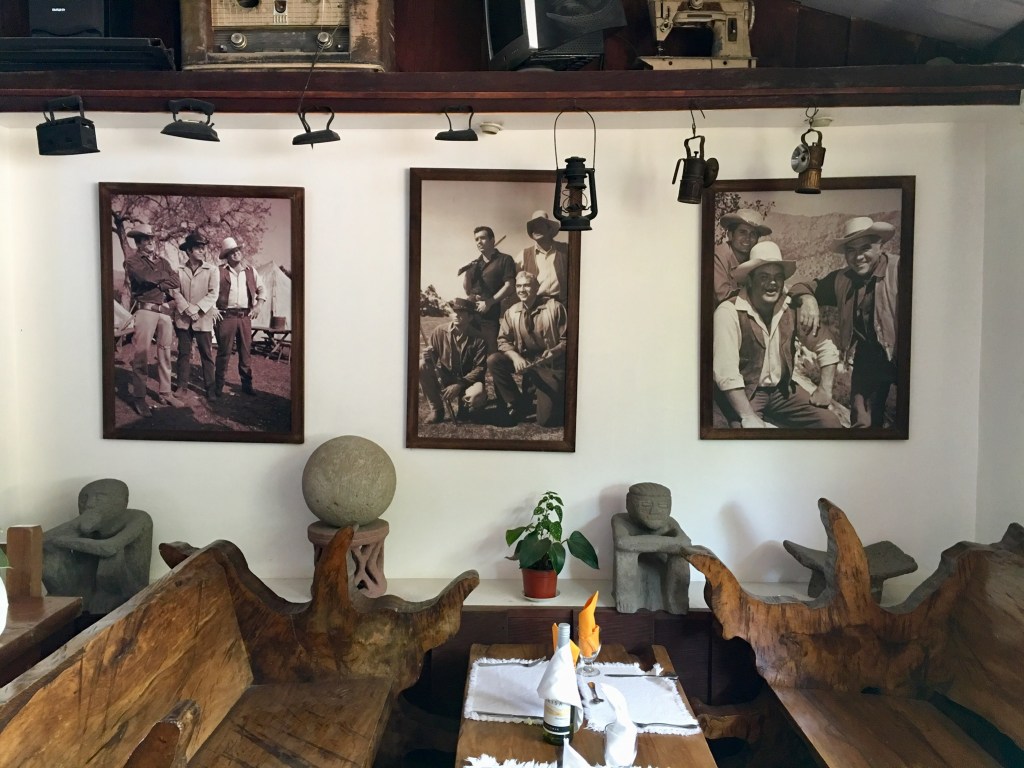 The second stop was at a curious restaurant-type establishment. From the outside it looked like it belonged in a European mountain range. There was a small buffet cafeteria in the front of the restaurant that was serving breakfast. To get to the bathrooms, you had to walk through the then-closed restaurant. The restaurant décor had an American Old West theme, complete with dark heavy-wood tables and surprisingly, framed posters of the Cartwrights from the old TV show, “Bonanza”!