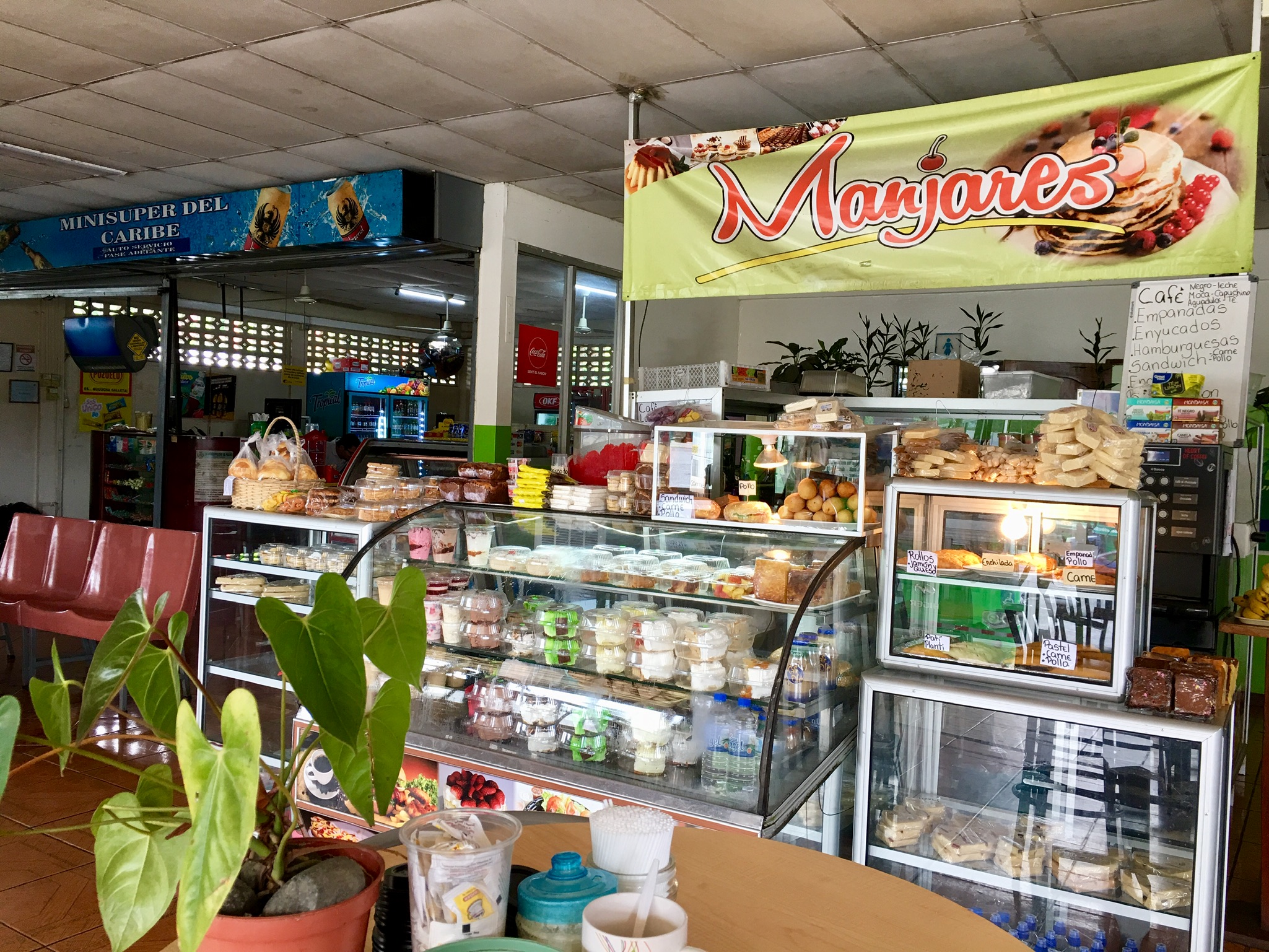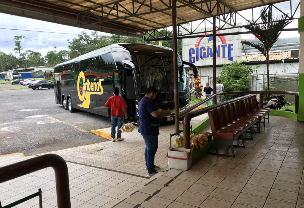 On the way to Playa Cocles, we stopped only one time, at a bus stop, Corporacion Terminales Del Caribe. The inside of it was divided into several sections, kind of like a truck stop. One section was a more sit-down cafeteria, one section had a kiosk surrounded by high tables where you could purchase coffee and smaller food items, and there was a section where you could purchase packaged snacks.