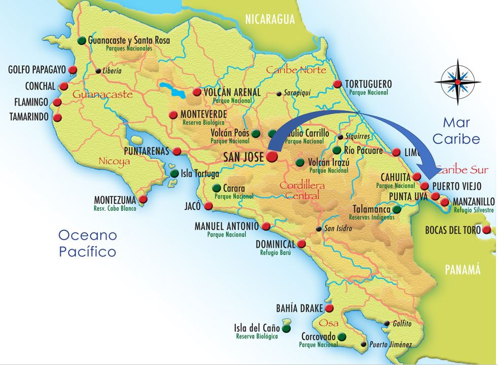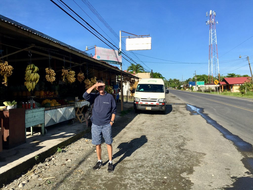 Since we still don’t own a car in Costa Rica, we contacted a transportation service, EasyRide, to get us to and from Playa Cocles. EasyRide coordinates shared van transportation to and from popular destinations in Costa Rica. It was very easy for us to schedule on-line. The only catch was that we had to be picked up from and delivered to a hotel, rather than our Escazú Village apartment complex. The nearest hotel is the Wyndham Garden (the same hotel that the van driver recognized on our return from Tortuguero). Although the Wyndham Garden is technically within walking distance of our apartment, it is an impossible walk with 2 pieces of luggage, 2 backpacks, a camera case, and sidewalks only part of the way.