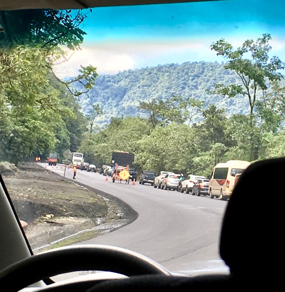 Like our trip to Tortuguero we traveled on Highway 32 through the Braulio Carrillo National Park. This is the main road to the Caribbean side of Costa Rica. The park is beautiful, but they are continuing to do road work. In multiple spots they let only one lane of traffic through at a time. If you are not on the side where the traffic is going through, you have to wait in line until they open up your side. Depending on timing you could be stopped more often and wait longer with each stop. This is what happened on the way to Playa Cocles. Our van was very near the front of the line when our side was stopped, which meant that we had to wait longer each of the three times we were stopped. On the return trip our timing was better; we only had to stop twice, and since we were near the end of the line each time, our wait was shorter. Of course, stopped vehicles with nowhere to go present an opportunity for enterprising individuals who walk along the line of vehicles selling food.