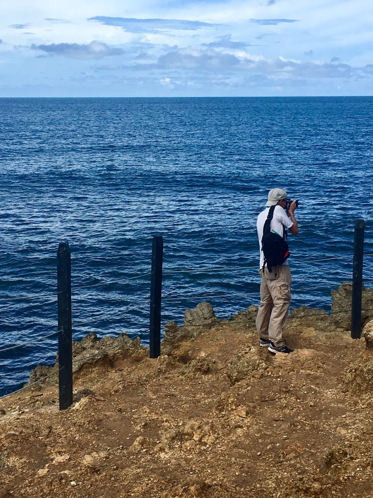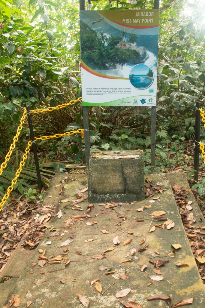 The trail was not only narrow, but in some places steep and muddy. Walking sticks and hiking boots would have been ideal, but we didn’t have those with us, so we muddled along the best we could, and managed not to fall, although we came close a couple of times. Eventually we made our way back to the large main path, where there were a lot of people. The main path leads out to a beautiful overlook of the Caribbean Sea, called Miss May Point. Miss May was the wife of the family that originally owned the land. The husband’s grave is near there.