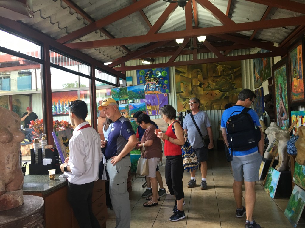 There was also a garden area in the back where we could take pictures. The garden area had various art canvases and coffee for sale. We were just about to take a sample of the coffee when our guide brought us small paper cups filled with a home-made liquor (also for sale?) mixed with soda and ice. The John’s and I politely tasted it – it had a noticeable kick and did not go down easy!  When our tour guide wandered off, we quickly threw away our (full) cups and grabbed the coffee sample to get the taste out of our mouths. We were given sufficient time to definitely decide there was absolutely nothing we wanted to buy there and returned to our van. The tourists from the large bus had already departed.