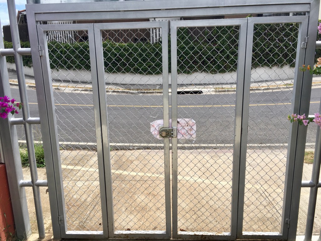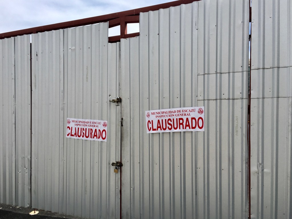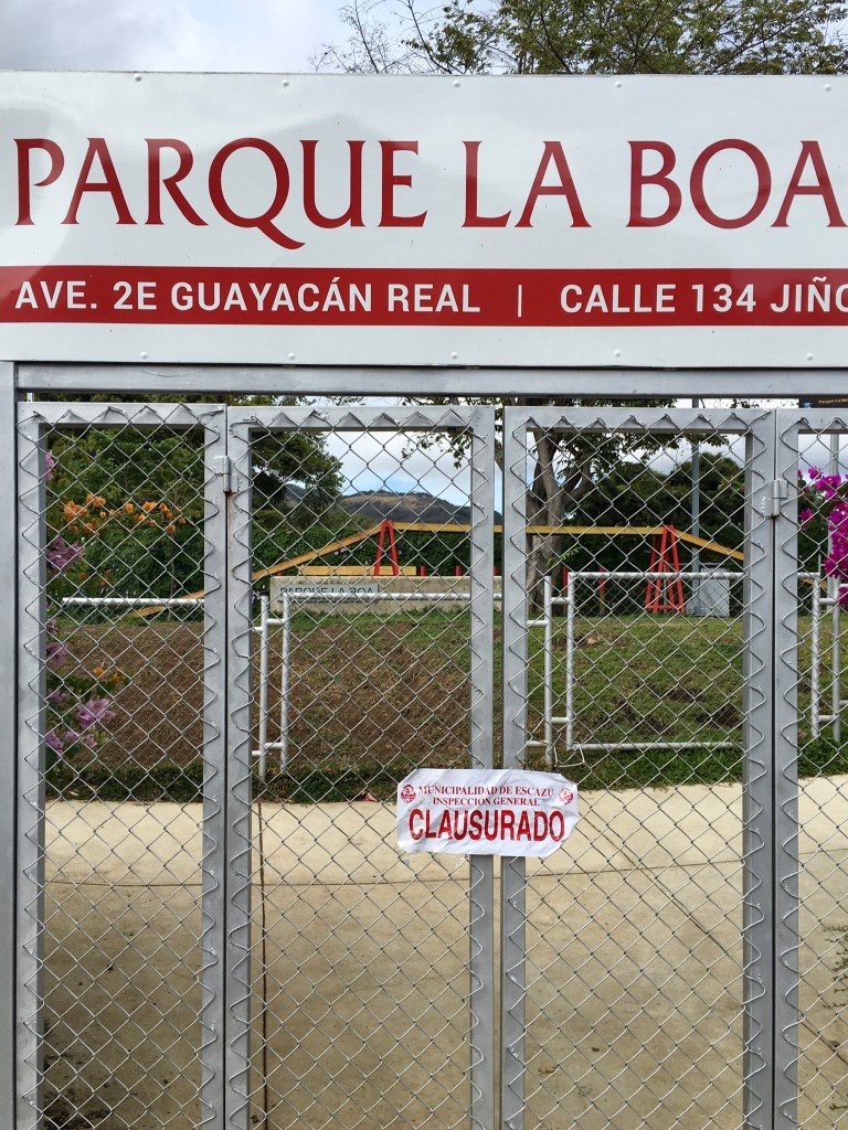 In Escazú, we started seeing “closure” stickers posted on parking areas and public parks. This was somewhat amusing. For example, there is a nearby gated parking area that we go by during our morning walk/run. In the past, we’d seen this area used by not only cars, but shuttle type buses for tourists and students. Presumably with the closure of tourist spots and schools, no vehicle needed to be parked there. The city of Escazú came by after it was already shut and padlocked for several days, and plastered two closure stickers on it. The city also padlocked a public park, Parque Buenaventure (check this), and slapped a closure sticker on it