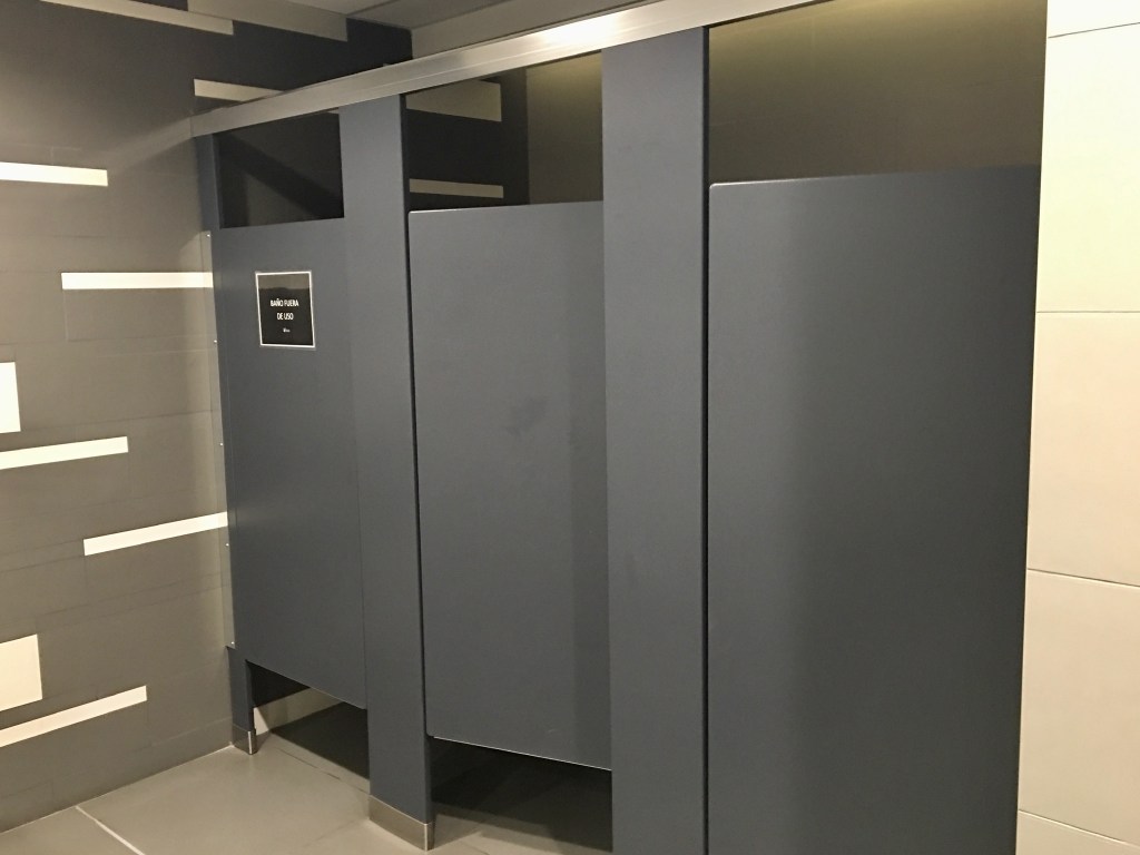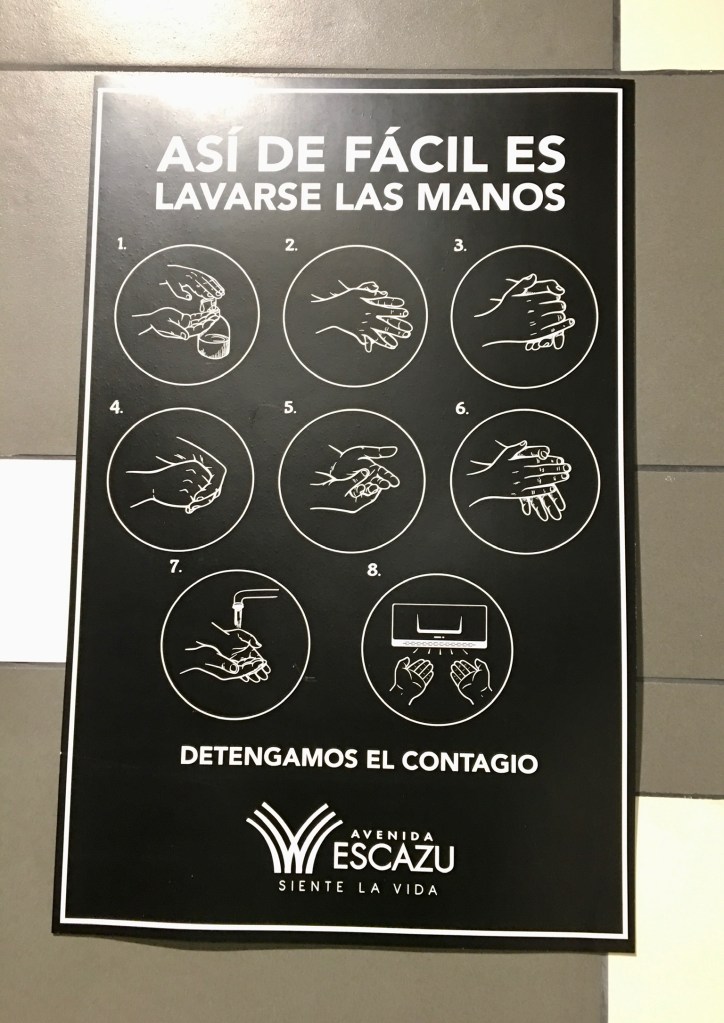 There is a public bathroom in Avenida Escazú that I have to admit, I was somewhat surprised to find remained open. They did make some adjustments. First, they put signs explaining how to properly wash your hands. In the women’s restroom, they also closed off one of the three bathroom stalls. But the one they closed was the one at the far end. If you are going to retain social distancing (or piss-tancing, as I have seen it called), it would seem to make more sense to close the one in the middle. John did say that of the three urinals in the men’s restroom, the middle one was covered in plastic and marked with yellow police tape. However, there are also three stalls in the men’s restroom, and the one on the far end was also closed. Finally, there is a separate, unisex, handicapped restroom next to the women’s restroom. This was closed entirely.