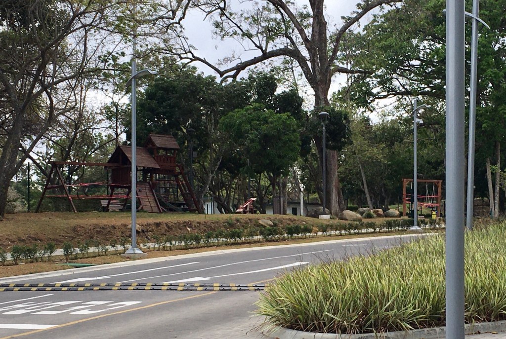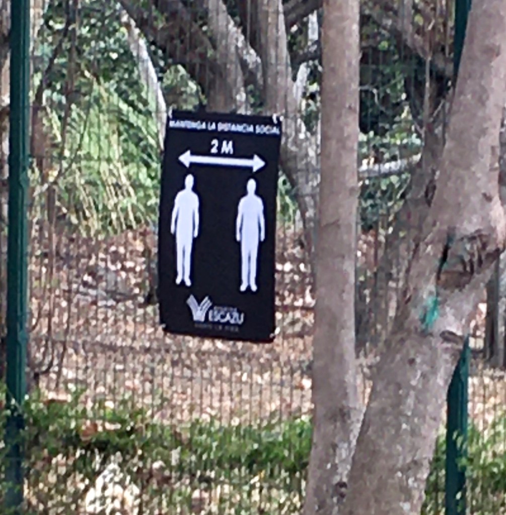 There is another park area near Avenida Escazu. This has a road that runs through it that some people are permitted to drive through. The park officially closed the road to through traffic on the weekends, but people can still go in it. Social distancing signs were posted in the park, but they might be a bit off in their message. They look like the signs you see posted in front of amusement park rides – you must be this tall to ride the ride.