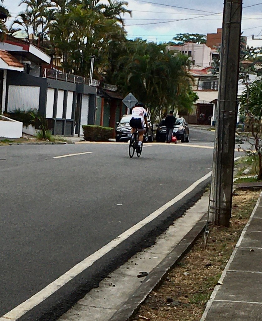 John and I don’t eat out often, usually only once a week on the weekend. When the virus shut down the restaurant dining experience, we decided we would try delivery, with mixed results. One Saturday night we ordered from our local Italian restaurant in Avenida Escazú via Uber Eats and were so looking forward to eating a couple of our favorite dishes. Uber Eats confirmed that Pablo had picked up our order and would be coming on … bicycle? Why weren’t we getting a guy on a fast motorcycle like we saw all of the time? We’d seen a few delivery guys on bicycles before, and they usually had motors attached to them, the annoying kind that sounds like a chainsaw. Still, we can walk to Avenida Escazú in about 15 or 20 minutes, so we figured that a bicycle delivery would be OK.