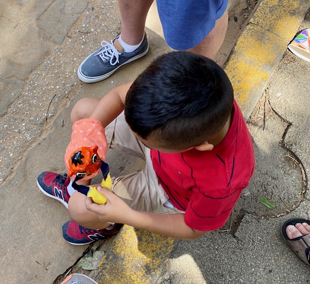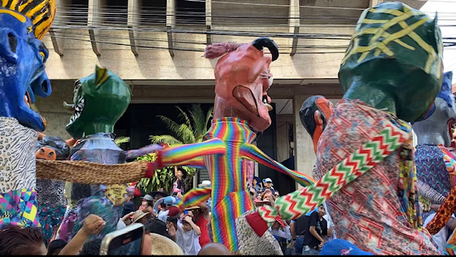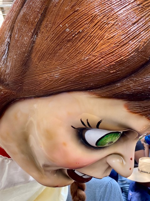 After the band moved through, a horrifying masquerade made its appearance down the street. This one was not made of paper mache, but hard plastic. It was a female with long braided hair. Its face could best be described as a female version of the Chucky character in the Child’s Play slasher film franchise. It was terrifying enough from afar, but then it bent its giant head over to the child sitting at our feet! I am certain that boy will have nightmares and possibly need therapy for years to come!