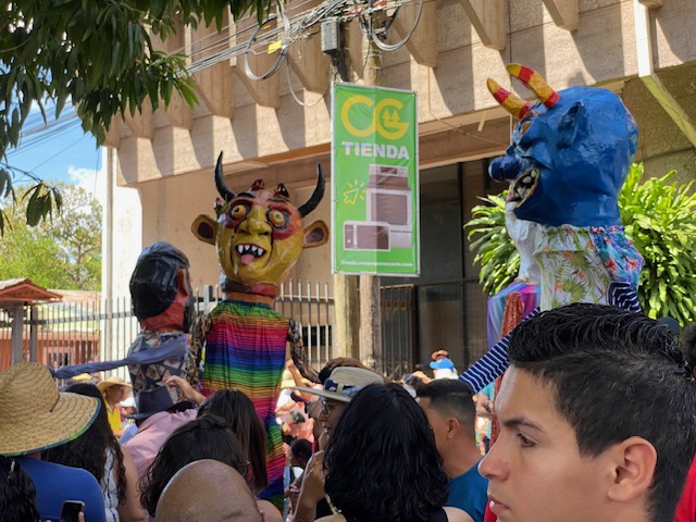 Undeterred, we had a quick in-person chat at Don and Marty’s house later in the afternoon on Friday, the day before, to see what we could get figured out. Don and Marty had heard about this festival from their local property manager who admitted that information mostly came by “word of mouth.” While we were there, Marty then reached out to a gringo that owns a nearby business who usually has good intel on things that go on around here. He responded that he didn’t know details but would ask his local employees and get back to her. We enjoyed some wine while we waited. He did call back with some information. There would be a parade on Saturday, but it would be a “Masquerade” parade that started at noon. Following that there would be the events in the stadium, presumably rodeo type events and the popular one here where everyday guys get in the ring with bulls and chase it or get chased by it. We were told that the stadium events were supposed to start at 2:00 p.m. but probably would start later, maybe 2:30 or 3:00, or … whatever. (Precision is not a thing here.)