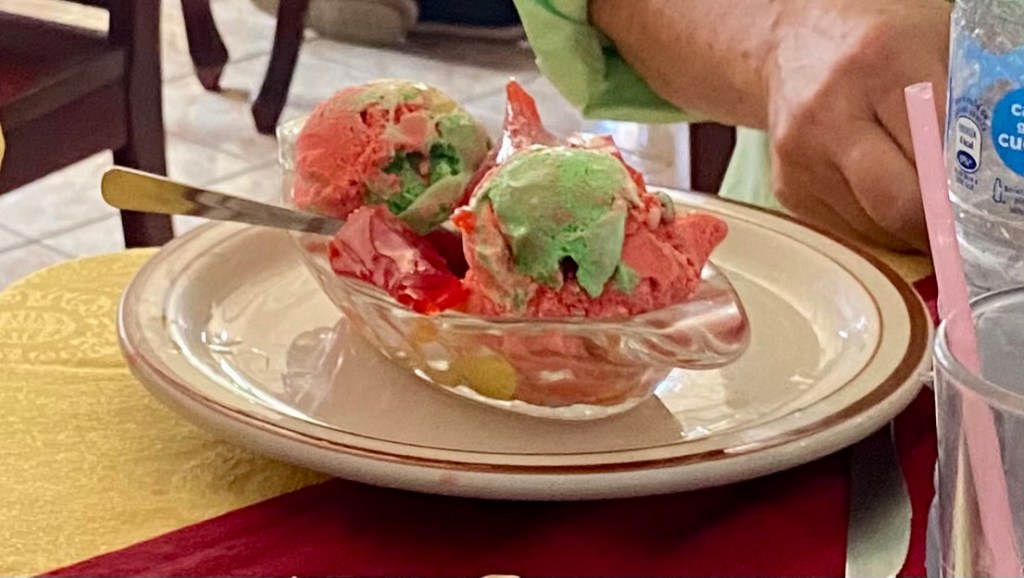 When the fruit salad arrived, it certainly wasn’t what Marty had expected. It turned out to be two colorful scoops of ice cream over jello, with a few pieces of fruit underneath all of that. To be fair, Marty did admit that the fruit “salad” was under the dessert area of the menu, but after all, in some (other) countries, they do have fruit on the dessert menu. We all sampled the fruit salad – although unintended, it turned out to be kind of a nice way to end the meal.