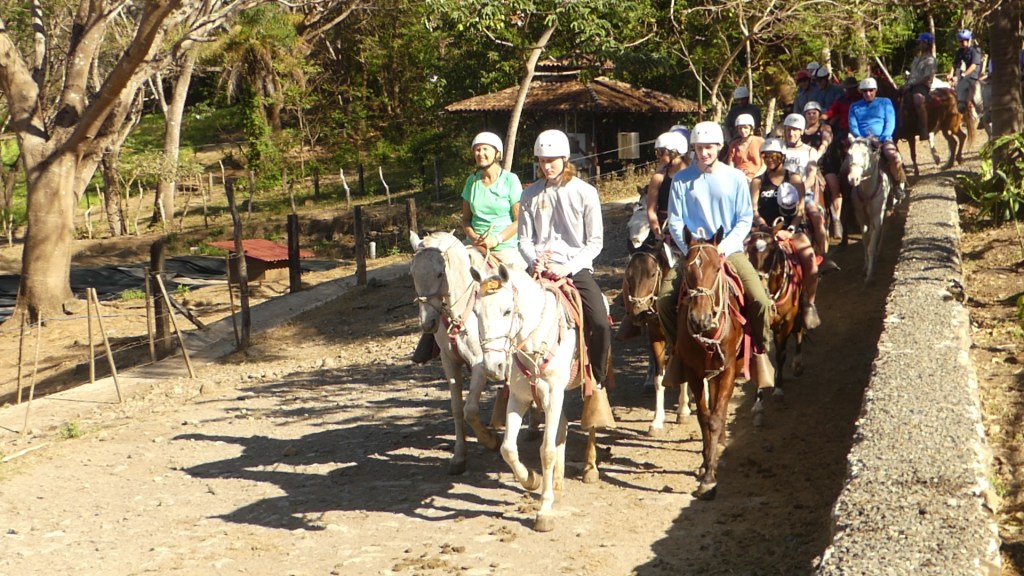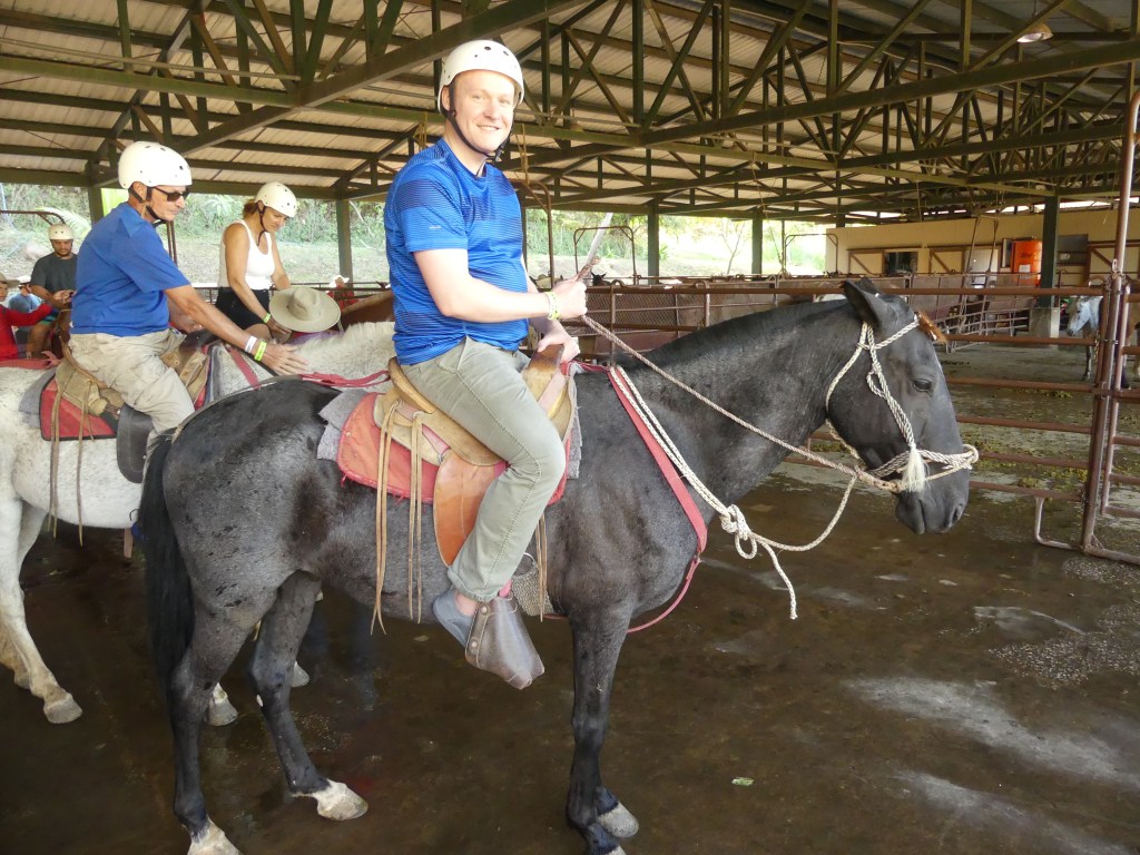 Sunday was our Adventure Day tour. We ate breakfast from the buffet at the casual restaurant, and then dressed and “packed” for the day. As instructed from the previous day, we dutifully wore our swimsuits under our horseback riding clothes, put our afternoon clothes in the plastic bags, where three of us also put sunglasses. John used the croakie to secure his sunglasses and we were off to the Adventure Center.